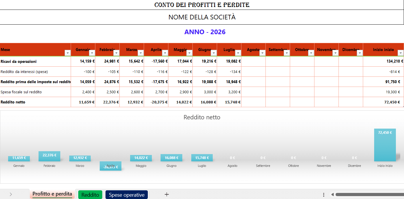 Il conto profitti e perdite (conto economico) è uno strumento fondamentale per comprendere l’andamento finanziario di un’attività. Con questo modello Excel per il conto profitti e perdite, puoi monitorare in modo chiaro ricavi, costi e risultato netto, ottenendo una visione completa della redditività nel tempo.
